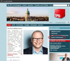 Beispiel: Da finden wir auf der Internetpräsenz der SPD im Boxhagener-, Rudolf-, Samariter-, Travekiez und in Stralau einen Link auf Antifa Friedrichshain: