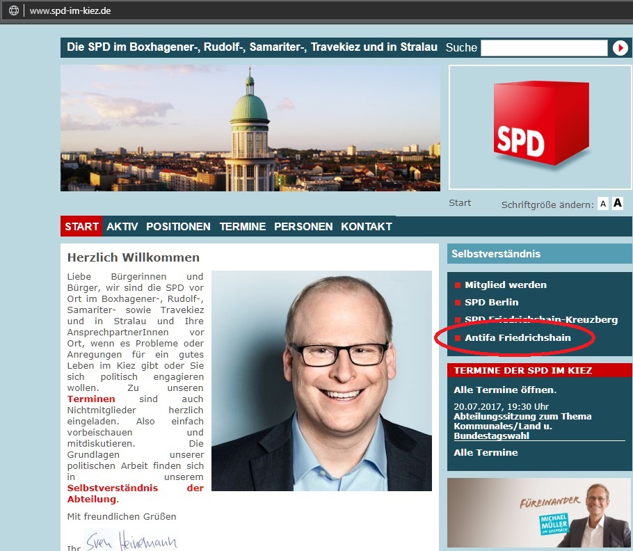 Beispiel: Da finden wir auf der Internetpräsenz der SPD im Boxhagener-, Rudolf-, Samariter-, Travekiez und in Stralau einen Link auf Antifa Friedrichshain: